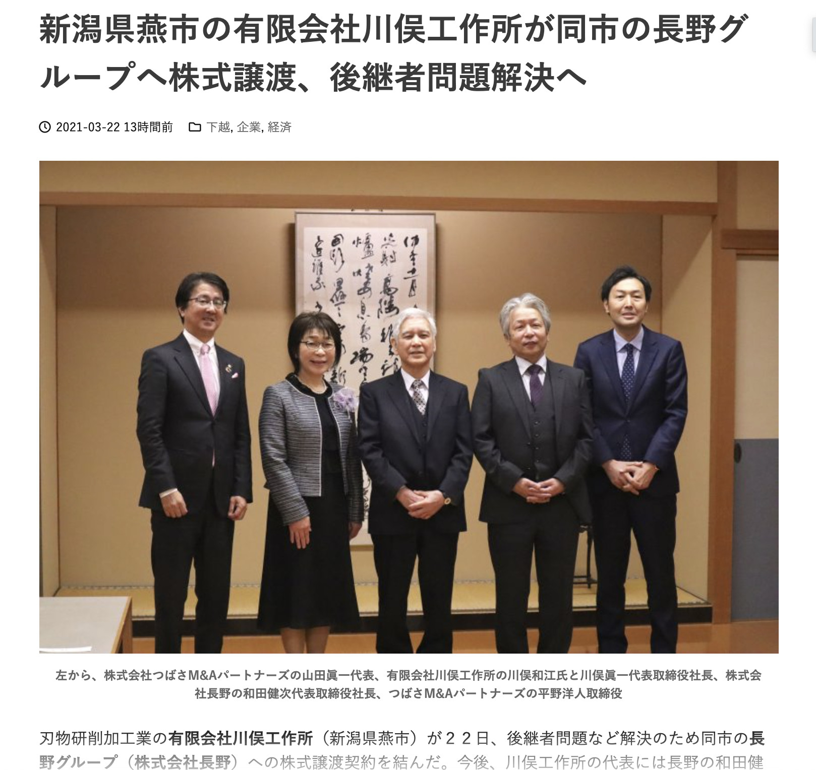 3月22日月曜日に行われた、有限会社川俣工作所様と長野グループ(株式会社長野)の和田健次代表取締役社長による、M&A調印式の様子がにいがた経済新聞で掲載されました。